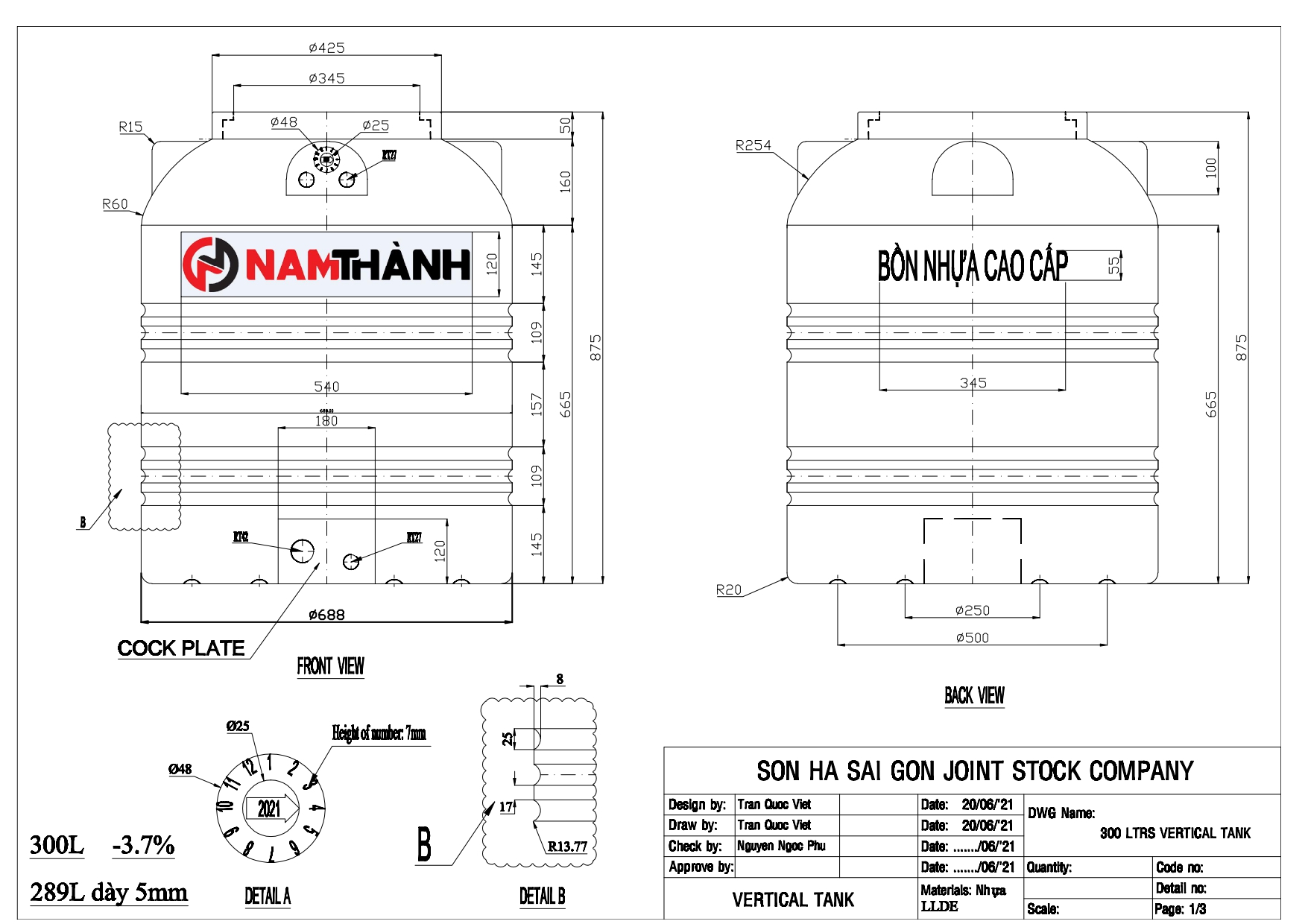 Bản vẽ nhựa Nam Thành 300 lít