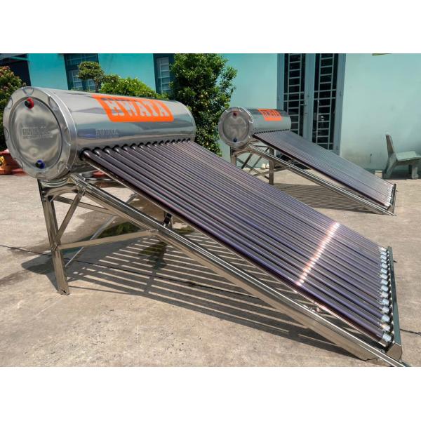 1. Máy nước nóng năng lượng mặt trời – bồn đứng, chân cao từ 0.8m -1.2m Bồn nước lắp trên khung chân cao giúp tạo áp lực nước tự nhiên cấp sang máy nước nóng, nước chảy mạnh, ổn định khi sử dụng.