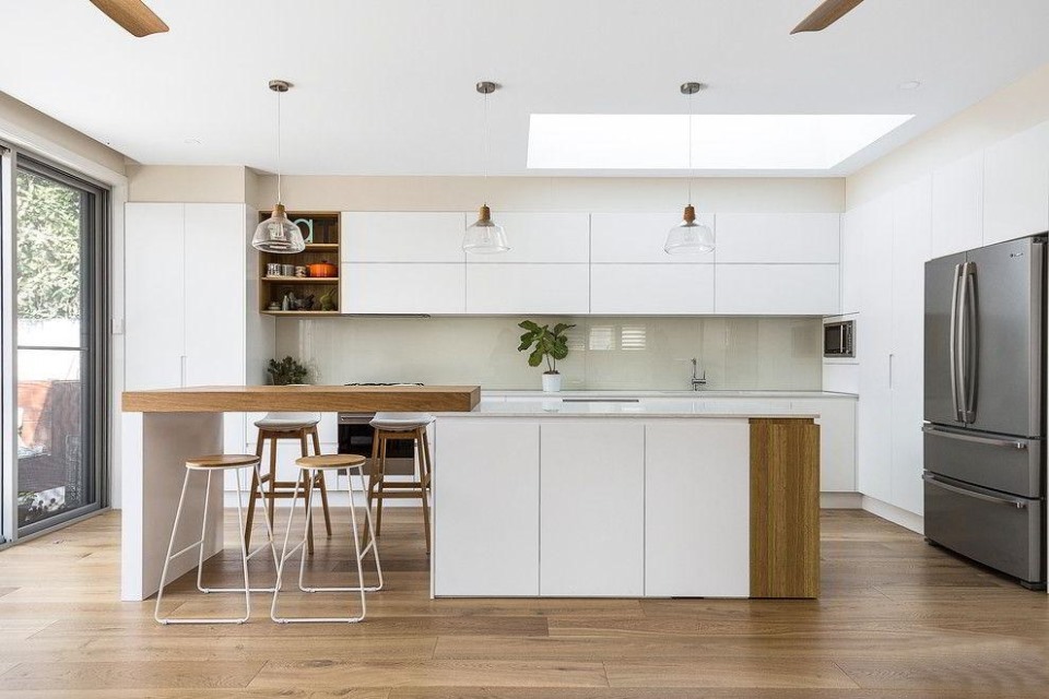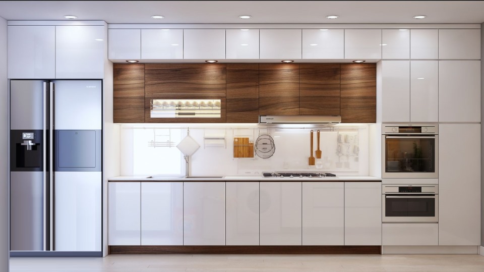 tủ bếp hiện đại phủ laminate màu trắng và vân gỗ