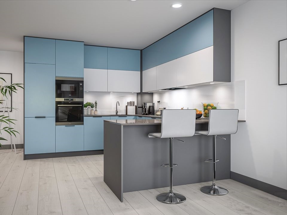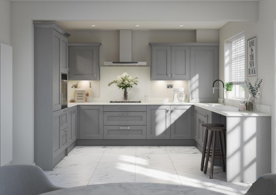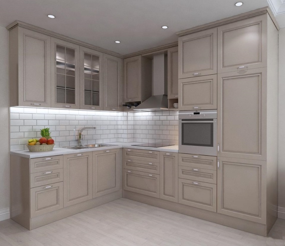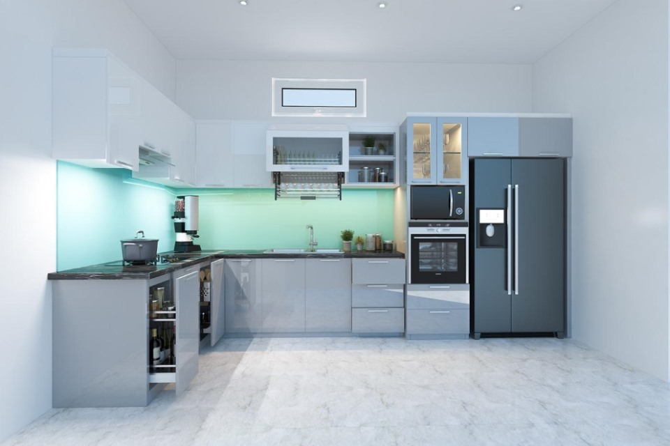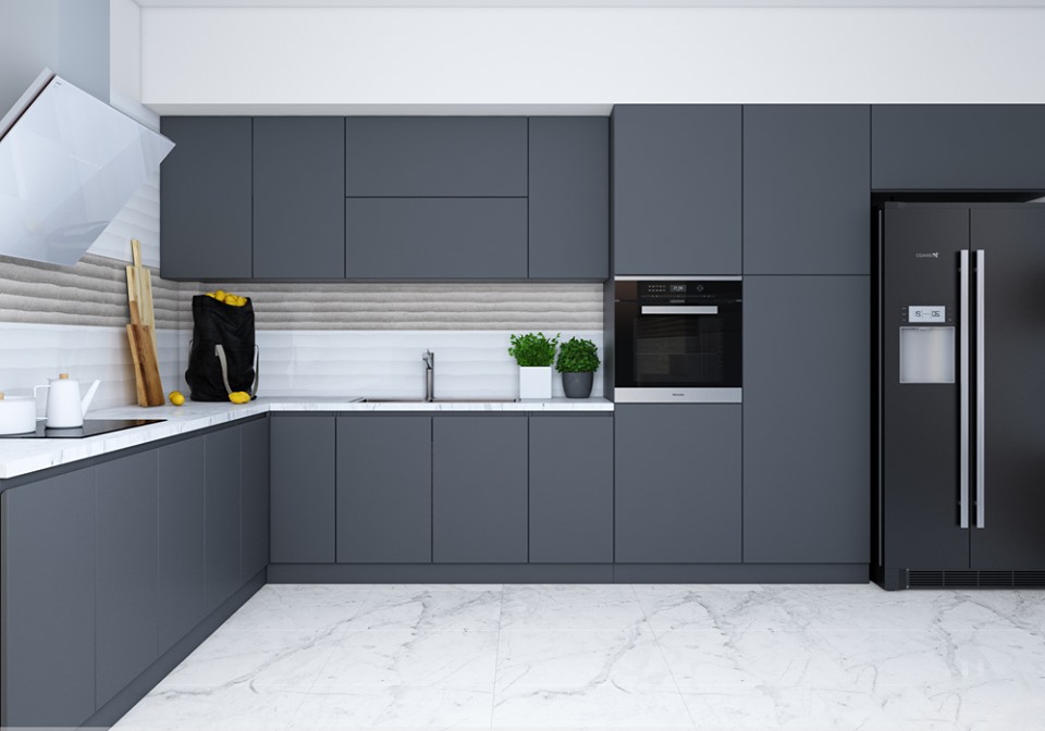 Tủ bếp màu xám trắng chữ L ​